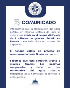 Acontecerbanilejo.com por: Glendy Marte, Baní.- El Instituto Nacional de Aguas Potables y Alcantarillados, a través de su dirección provincial INAPA Peravia, informó mediante un comunicado difundido en sus redes sociales que la disminución en el suministro de agua potable en varios sectores del municipio de Baní se debe a una avería detectada en el tanque vitrificado con capacidad de dos millones de galones, ubicado en la comunidad de Peravia.