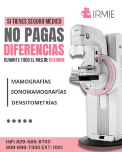 Acontecerbanilejo.com por Glendy Marte: A partir de hoy y durante todo el mes de octubre el Instituto Regional Materno Infantil y Especialidades, IRMIE, inicia su acostumbrada campaña rosa, un aporte en la lucha contra el cáncer de mama, consistente en la exoneración de co-pago, o lo que es igual: (sin pago de diferencia), en estudios preventivos como: mamografía, sonomamografia y densitometrías y aplicación de un 30 por ciento de descuento en pacientes privados.