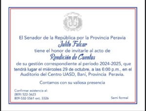 Acontecebanilejo.com por: Glendy Marte, Baní .- El senador de la República por la provincia Peravia, Julito Fulcar, realizará su acto oficial de Rendición de Cuentas correspondiente al período legislativo 2024-2025, en el que presentará ante la ciudadanía los principales logros, iniciativas y proyectos impulsados durante el último año de su gestión.