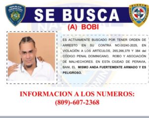 Acontecerbanilejo.com por: Glendy Marte, Baní.- La Dirección Regional Sur Central de la Policía Nacional, con asiento en esta ciudad de Baní, informó que se encuentra en la búsqueda activa de un individuo identificado únicamente como alias “Bobi”, quien es considerado armado y peligroso.